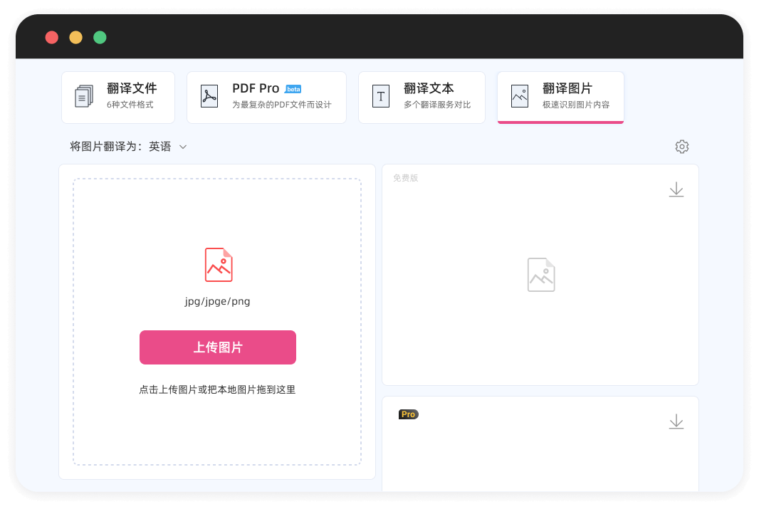On the "Image Translation" page, upload an image to quickly translate and download it.