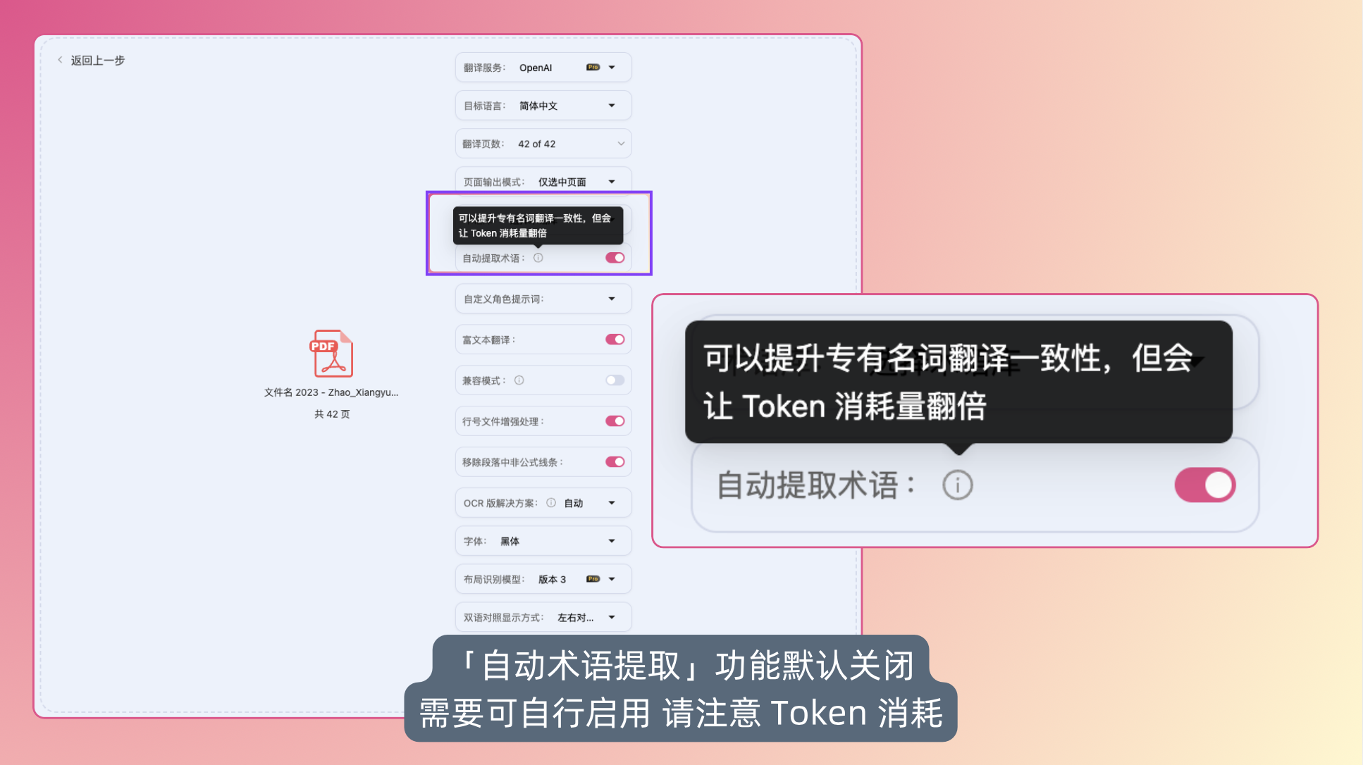 ⚠️注意:正如我们此前解释的一样(答疑|为什么用大模型翻译时,Token 消耗会多于文本长度),打开术语提取功能后,由于指令、文本额外处理、术语提取返回等流程,会消耗更多的 Token,这一功能默认是关闭的。