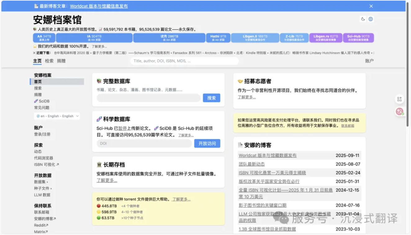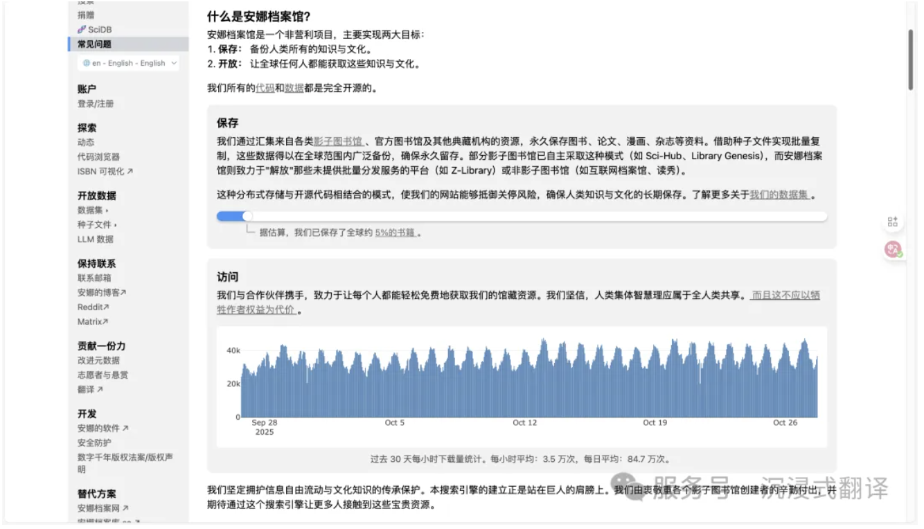 Anna’s Archive 界面简洁、功能直接,背后隐藏着一整套为“长期保存人类出版物”服务的庞大机制。它负责收藏一切图书(目前进度是人类所有出版物的 5%),沉浸式翻译负责帮你读懂这些书。P