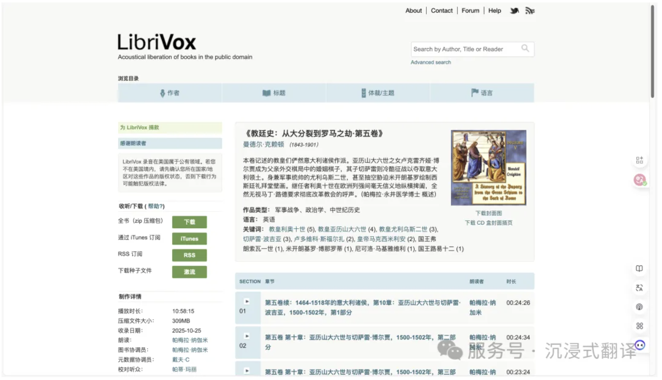 将沉浸式翻译与 LibriVox 搭配使用,可以在听书之前了解原版书籍的元信息,还可以了解朗读者的其他作品,给声音的体验再增加一个维度。