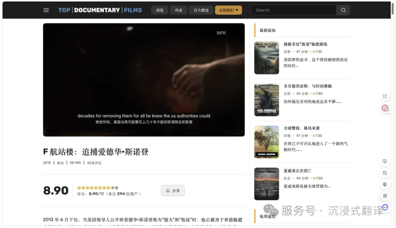 与沉浸式翻译搭配使用时,TDF 的含金量可谓进一步提升。你可以先用网页翻译了解纪录片的简介、评论、主题标签,然后在观看影片时开启双语字幕。
