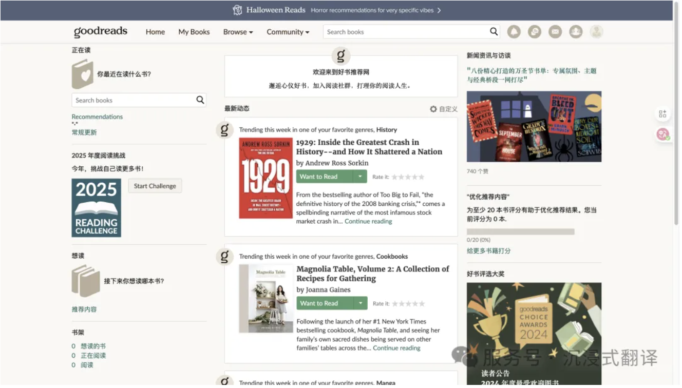 当和上面介绍的网站进行结合,你会发现 Goodreads 不只是查书的工具,更是阅读旅程的起点。你可以先在这里发现一本想读的外文书,在 Anna’s Archive 找到原文,在沉浸式翻译中阅读双语对照版,在 LibriVox 听到它的有声版本(如果是进入公共领域的开放版权书),甚至在Top Documentary Films 上查找相关议题,观看纪录片拓展认知。
