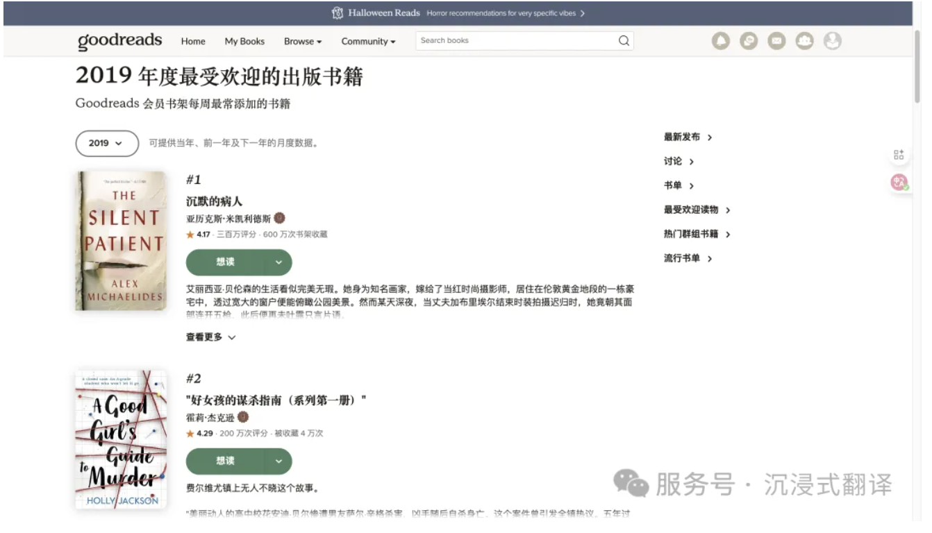 例如你可以查看 2019 年 Goodreads 的热门图书排行榜