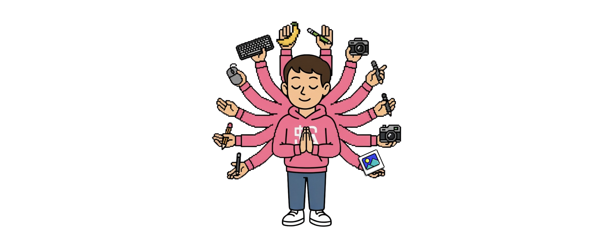 Add several extra arms to this character, posing like the Buddhist "Thousand-Armed Avalokiteshvara" to convey many abilities in one person, with hands holding a keyboard, mouse, pencil, stylus, and digital camera. 8-bit style, white background. Facial expression with eyes closed, giving a very zen feeling; remove the two downward-facing hands and arms. Angle facing forward.根据我们的测试以及社区的讨论, Gemini 有时候对中文的提示词响应不佳,偶尔会出现不生成图片的问题。