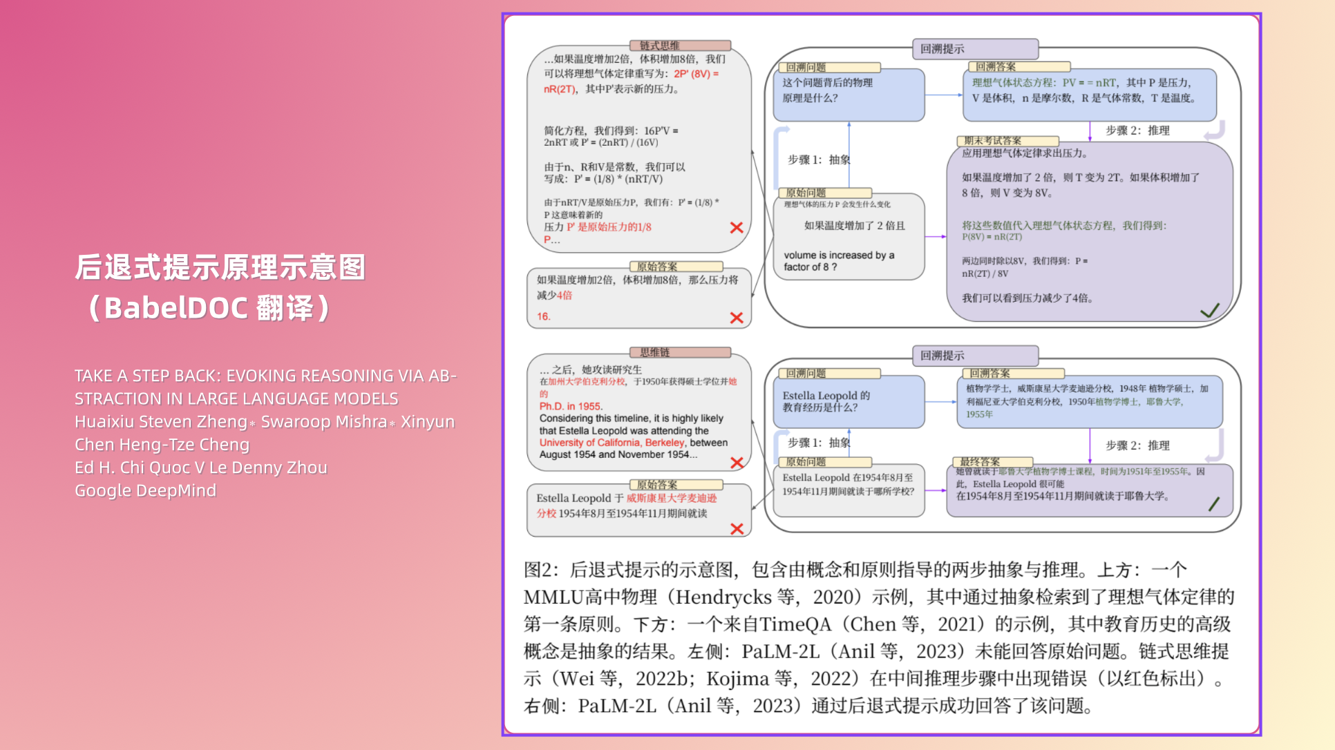 而 Step-Back Prompting 的思路是——先退一步,别急着解题,让模型先生成一个更抽象、更通用的“后退问题”,比如“这个现象背后的物理原理是什么?”“这位科学家的教育经历大体如何?”