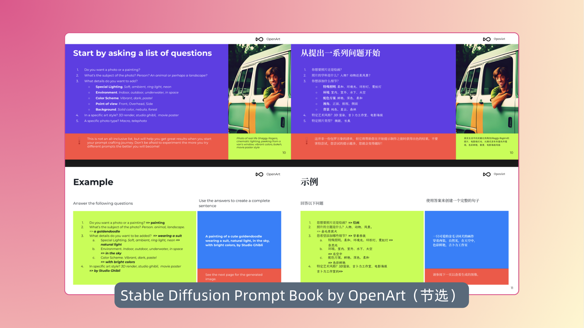 在看完前面这些内容之后,还有一个值得特别提出的收尾。 那就是 OpenArt 社区整理的《Prompt Book》——一份长达 105 页的提示词写作手册。