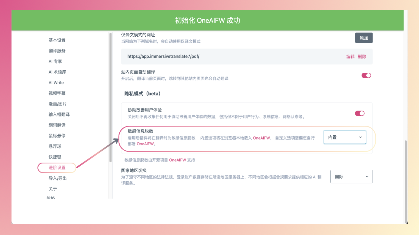 沉浸式翻译面板 → 设置 → 进阶设置 → 隐私模式(beta) → 敏感信息脱敏 → 选择「内置」