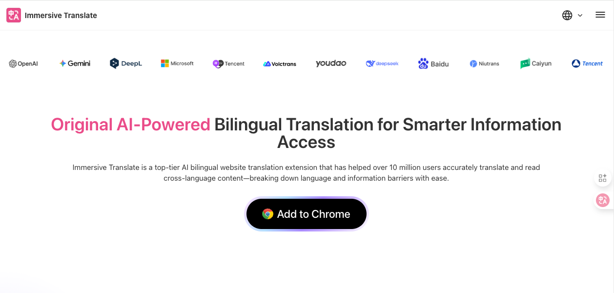 Instead of relying on one translation model, Immersive Translate integrates over 20 advanced AI engines — including ChatGPT, DeepL, DeepSeek, Gemini, and others.