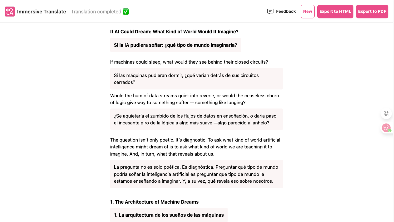 Unlike basic tools that work sentence by sentence, Immersive Translate interprets entire paragraphs. It identifies linguistic patterns, resolves ambiguity, and preserves tone. This context-aware model ensures that an engineering report doesn’t read like a marketing brochure — and that citations, formulas, and idioms remain intact.