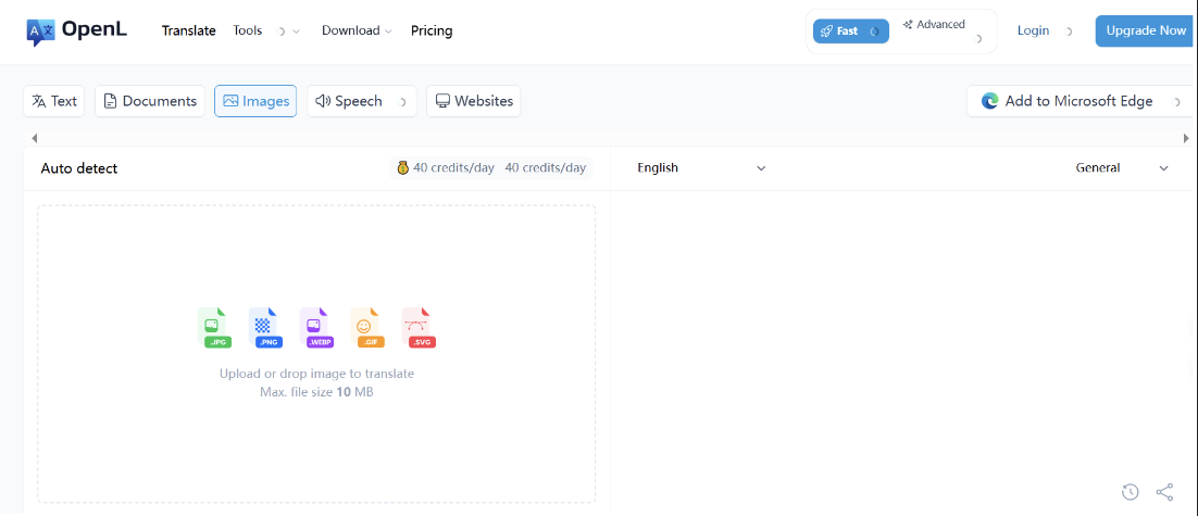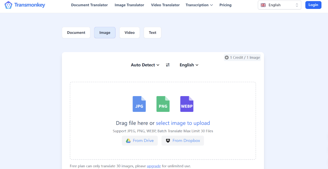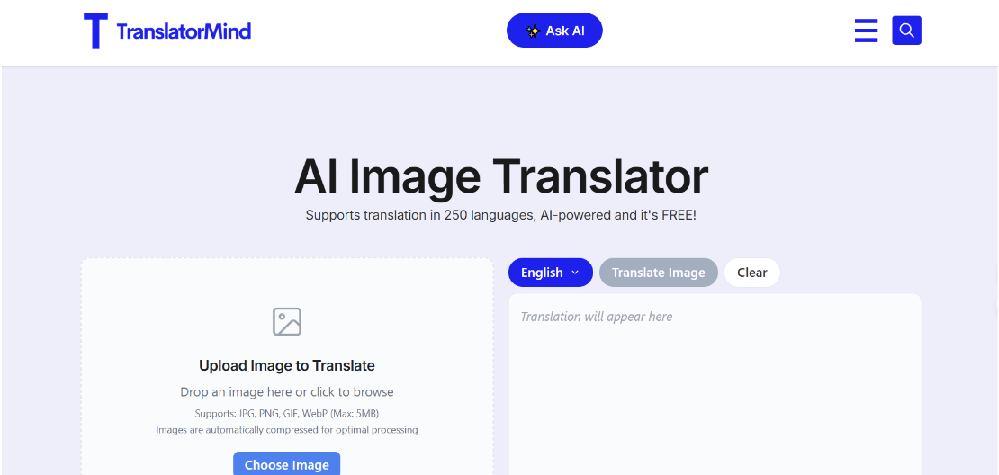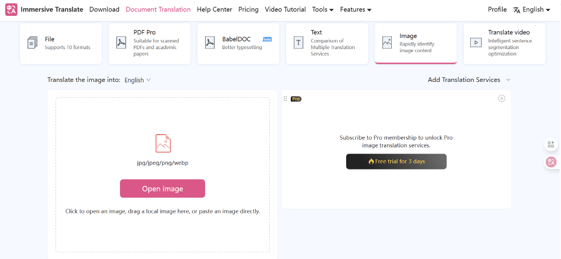 File Support: It supports JPG, PNG, and WEBP files, and can handle large images up to 10,000 pixels. It also allows batch translation of up to 30 files.