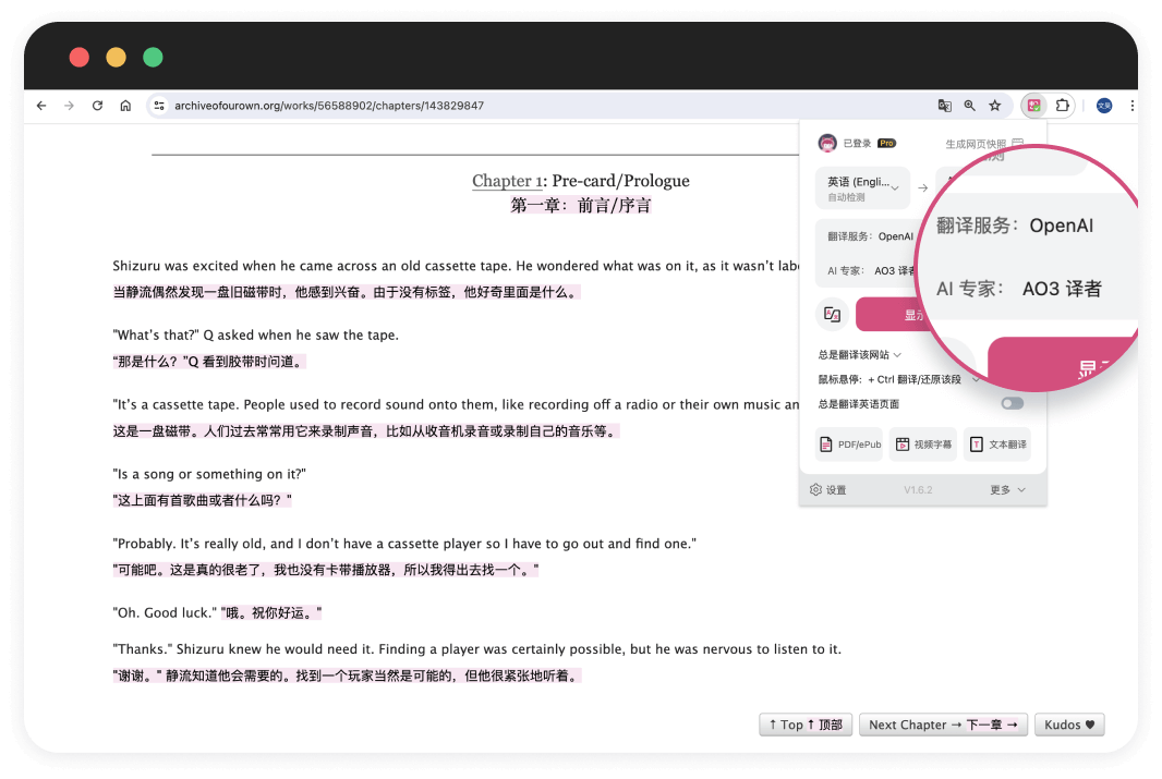 AO3 一鍵變雙語對照,超讚看文神器:沉浸式翻譯