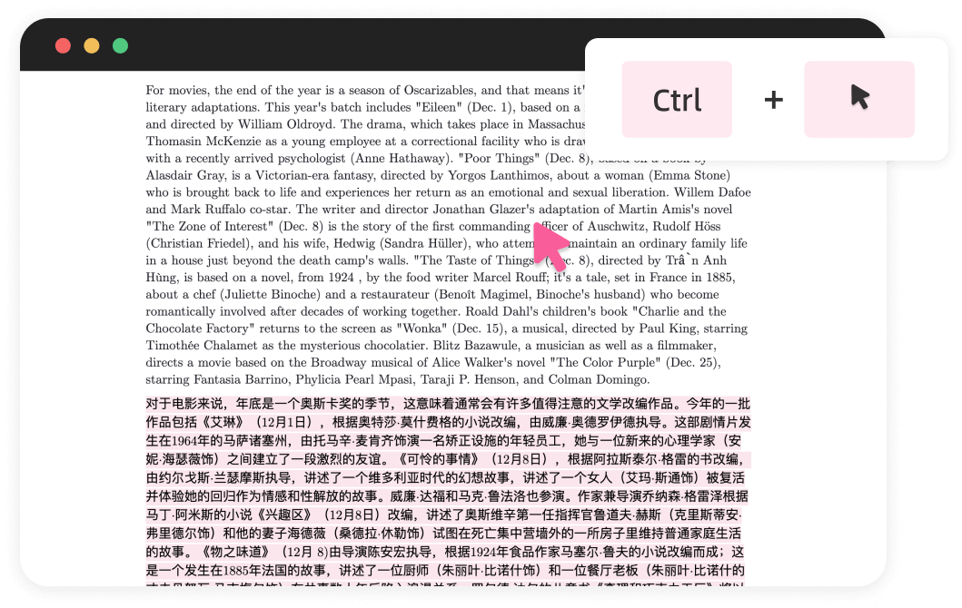 僅需將滑鼠停留在任意網頁的任意段落上,同時按下預設的快捷鍵(如 Ctrl),相應的譯文就會立即出現在段落下方。段落在【沉浸式翻譯】的設計理念中被視為最小單位,保留其上下文,這樣我們才能真正理解並學習外語。