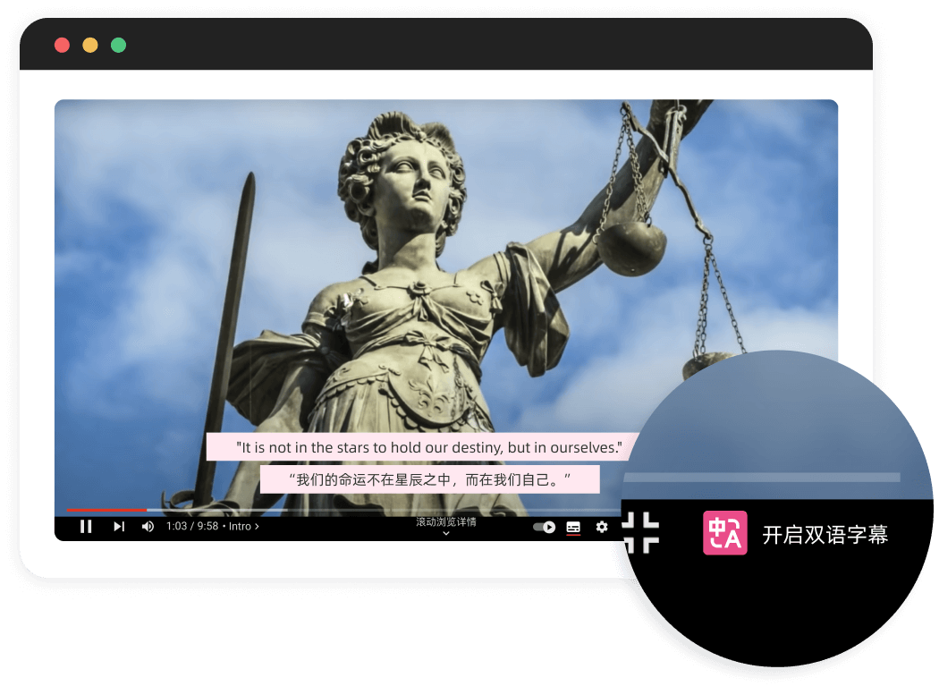沉浸式翻譯擴展支援包括 Youtube、Netflix、Udemy 在內的 60 多個國外的主流線上影音網站的即時雙語字幕翻譯。原汁原味的外語語音配合母語原文/譯文雙語對照字幕,您不僅能夠完全理解影音內容,還能在觀影過程中自然地學習外語,讓您在潛移默化中提高聽說讀寫能力。